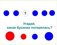 Интересная логическая игра для малышей. Из разноцветных бусинок составляется цепочка, в которой бусинки повторяются в определенной последовательности. И одна из бусинок потерялась. Малышу нужно угадать, какая из бусинок потерялась. Бусинки могут быть двух цветов - красные и синие, а также двух размеров - большие и маленькие. Малышу необходимо отгадать последовательность и выбрать нужную бусинку.